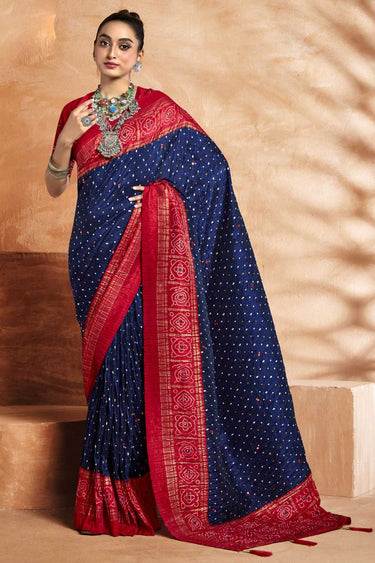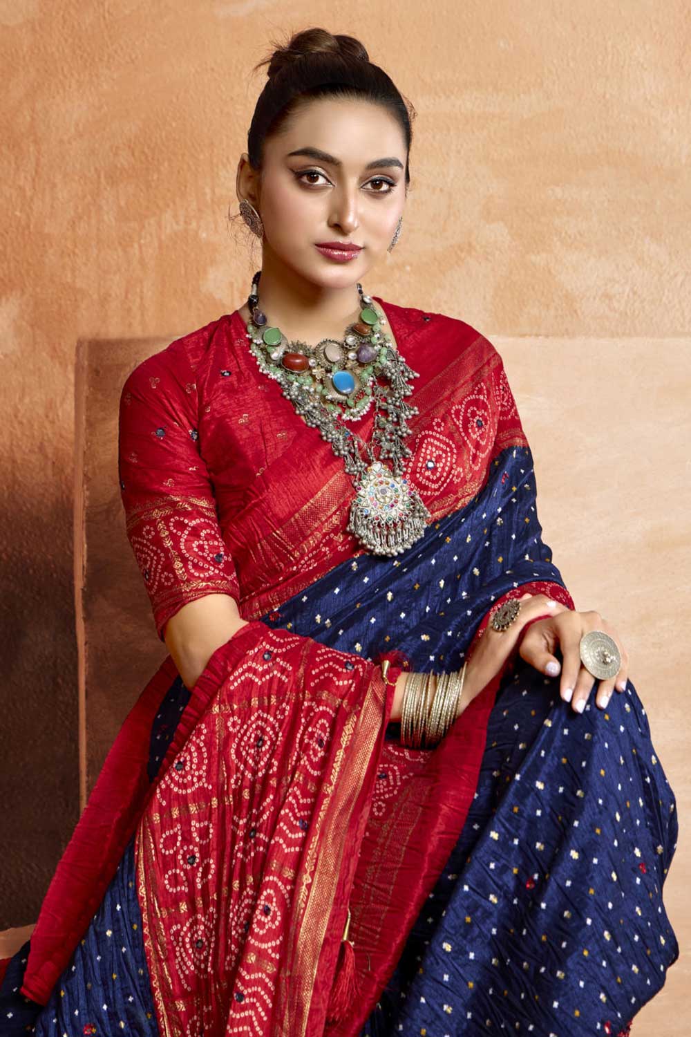 Engaging Navy Blue Color Satin Fabric Single Dot Bandhani Printed Saree