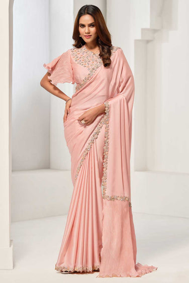 Engaging Peach Color Crepe Satin Silk Fabric Saree
