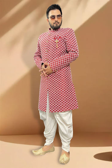 Engaging Red Color Silk Fabric Peshawari Style Indo Western Set