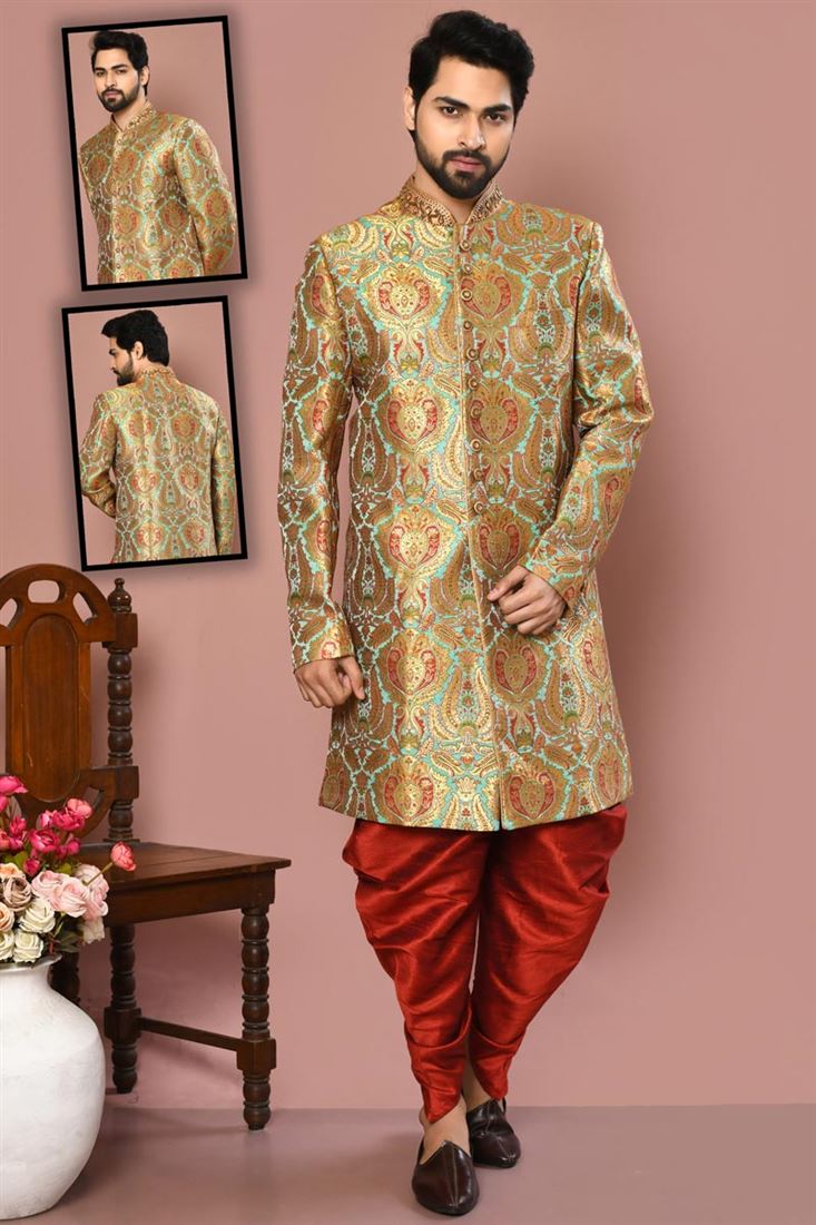 Engaging Sea Green Color Art Silk Fabric Sherwani