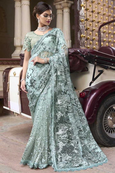 Engaging Sea Green Color Sequins Work Net Fabric Saree