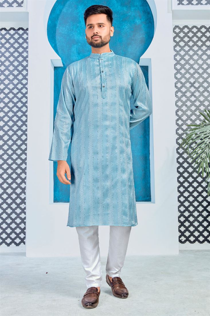 Ethnic Fancy Work Festive Jacquard Kurta Pyjama For Men In Sky Blue Color
