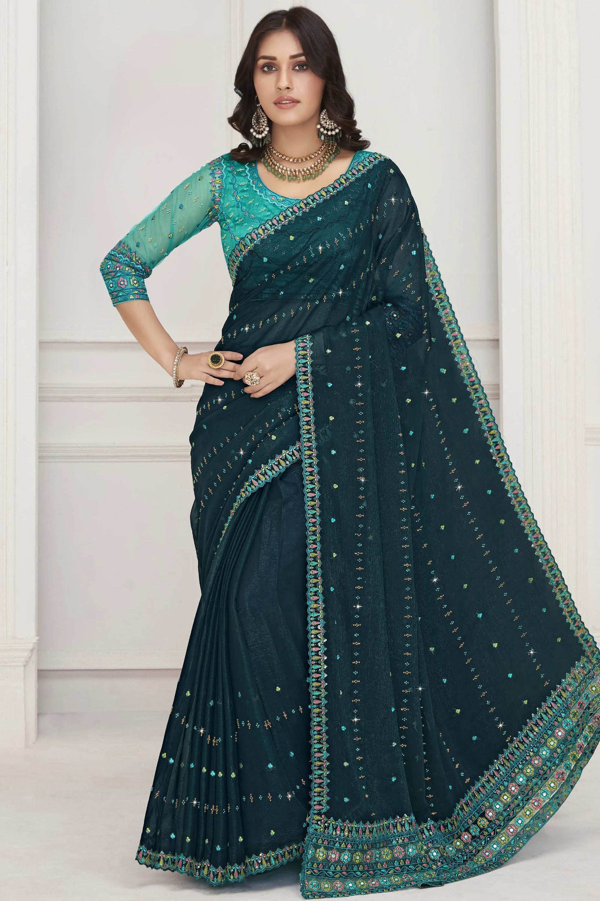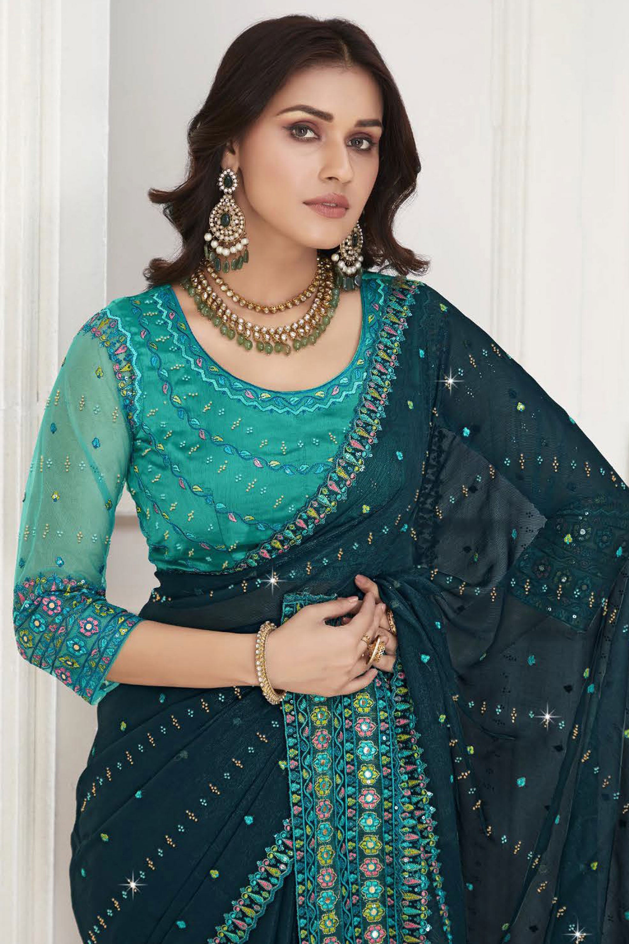 Excellent Chiffon Fabric Teal Color Saree With Embroidered Work