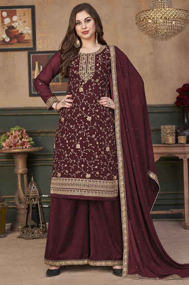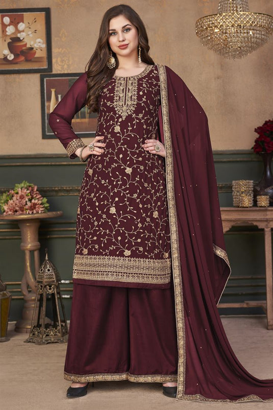 Excellent Georgette Fabric Maroon Color Palazzo Suit With Embroidered Work