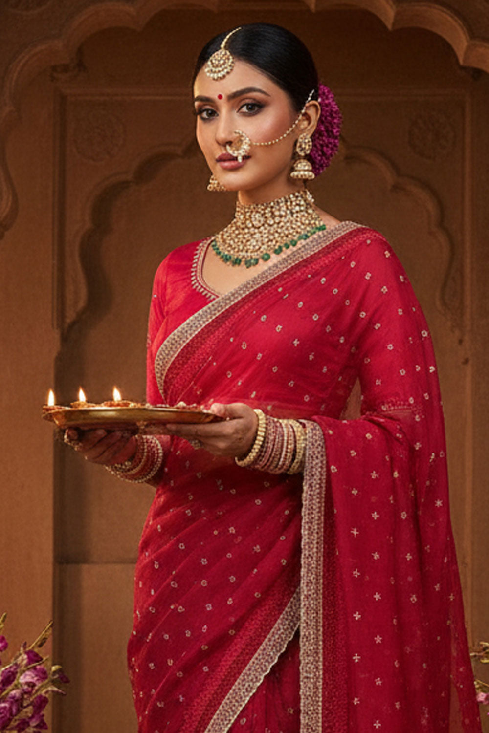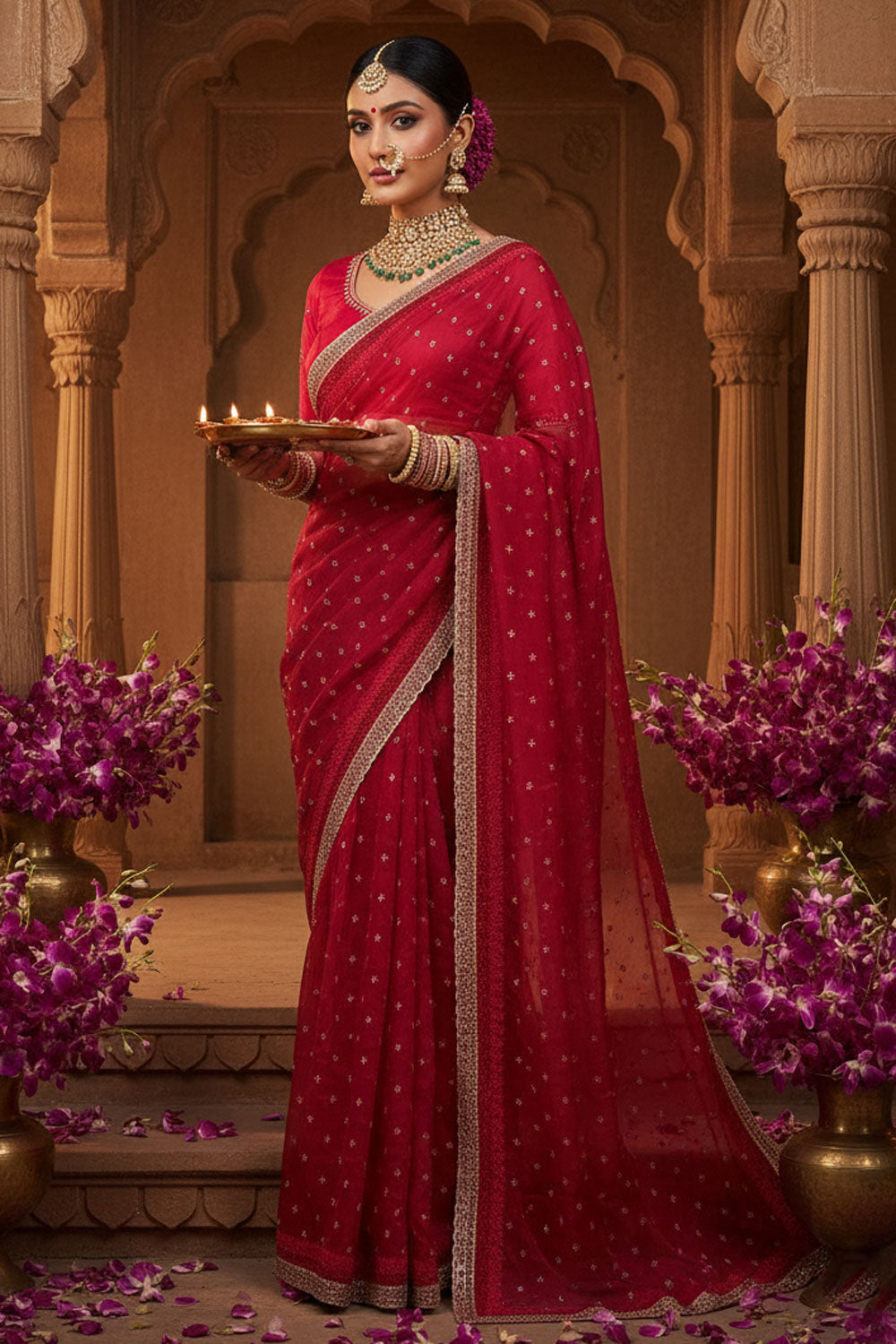 Excellent Georgette Fabric Red Color Saree With Fancy Work