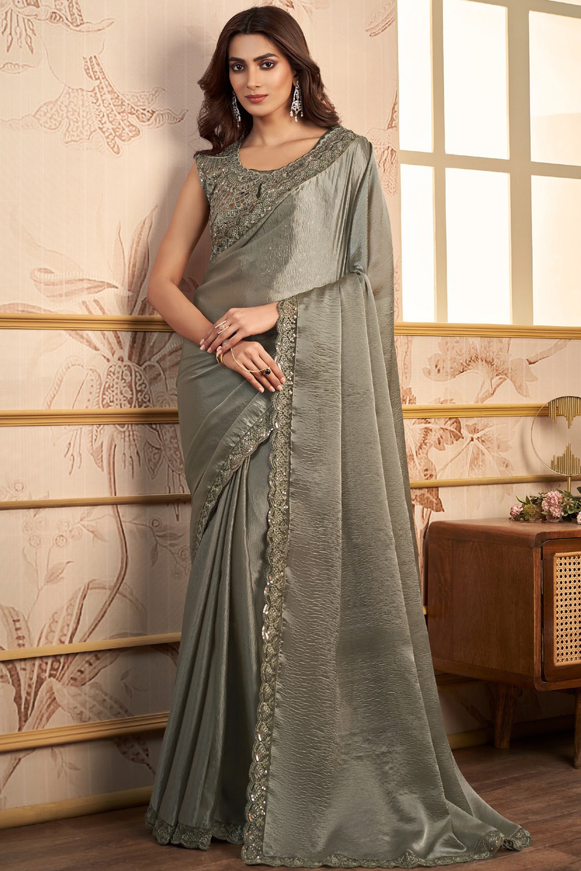 Excellent Satin Dark Beige Color Lace Work Saree With Heavy Embroidered Blouse