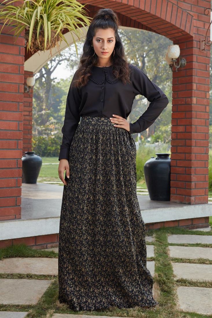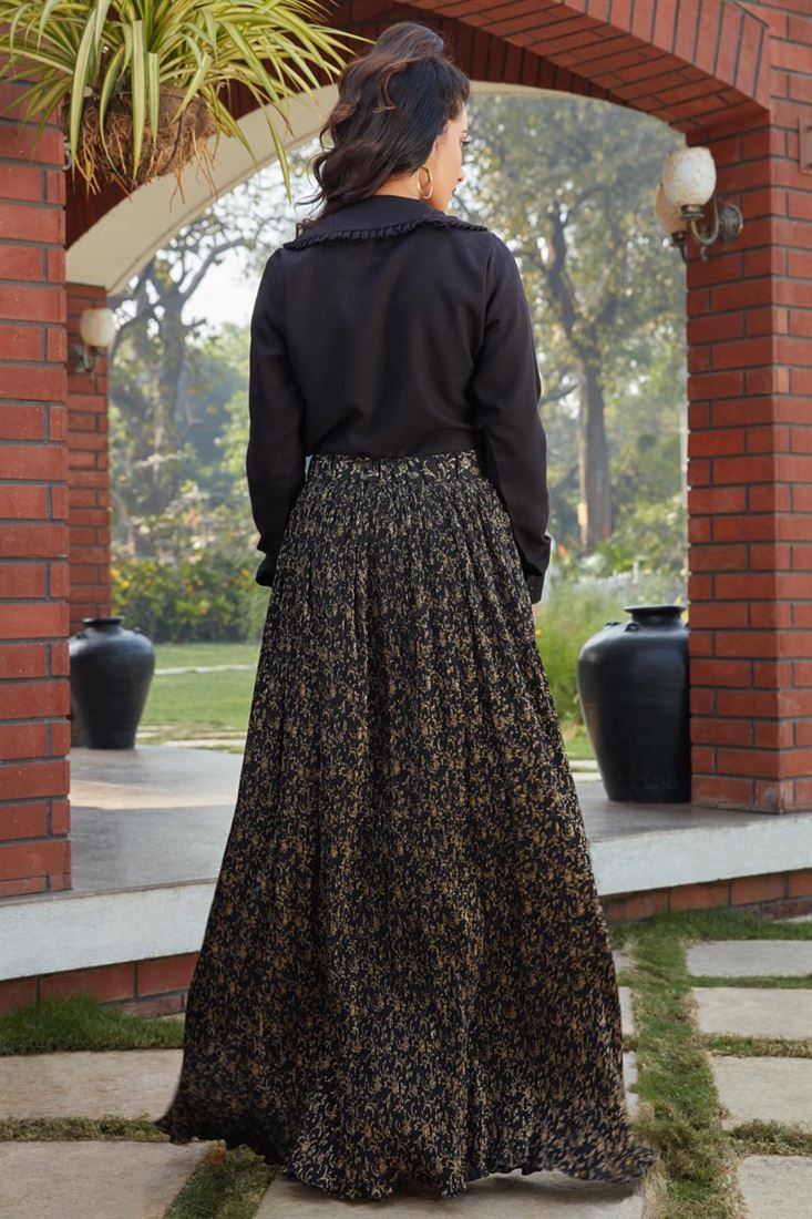 Exclusive Black Color Fancy Fabric Party Wear Indo Western Top And Printed Skirt