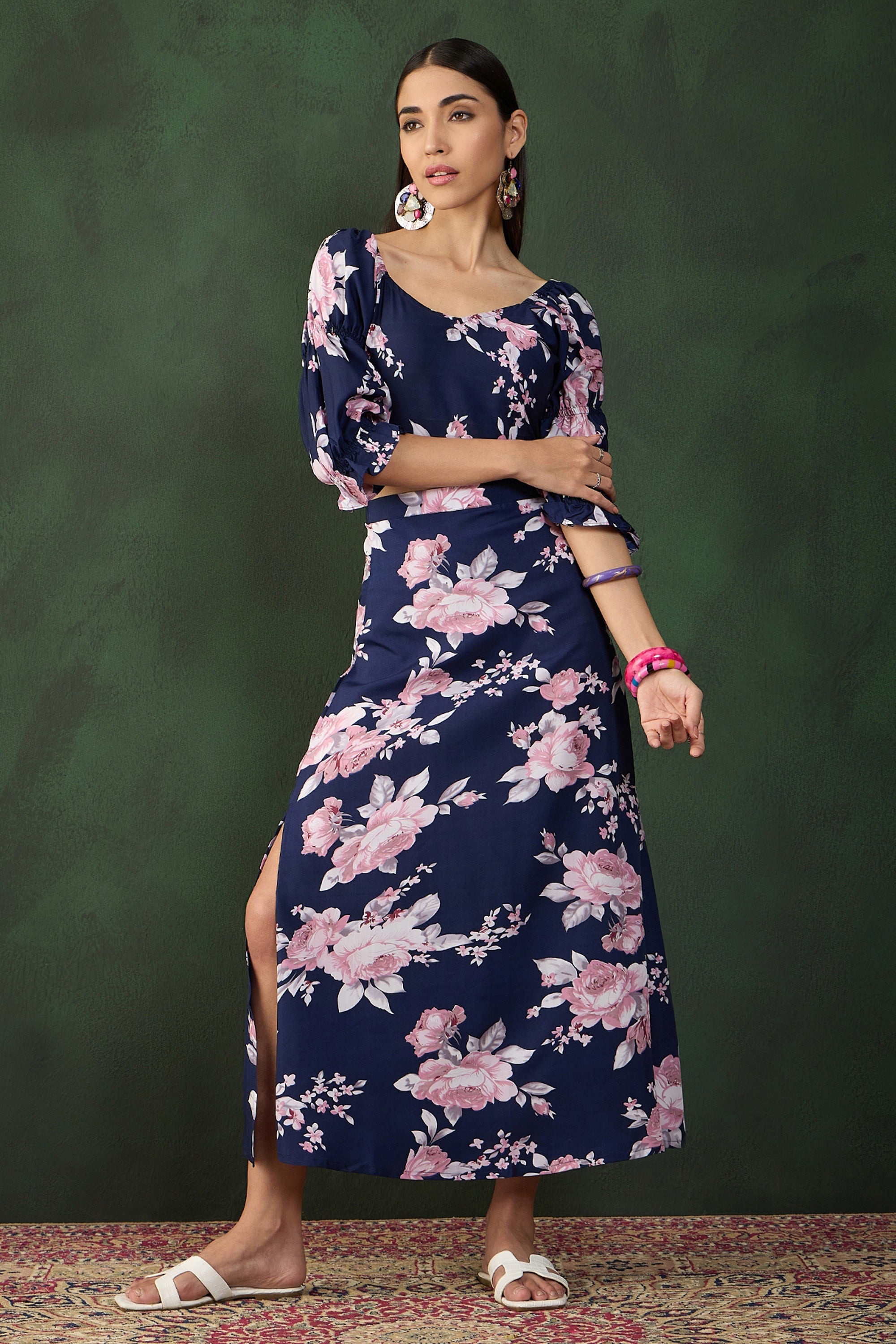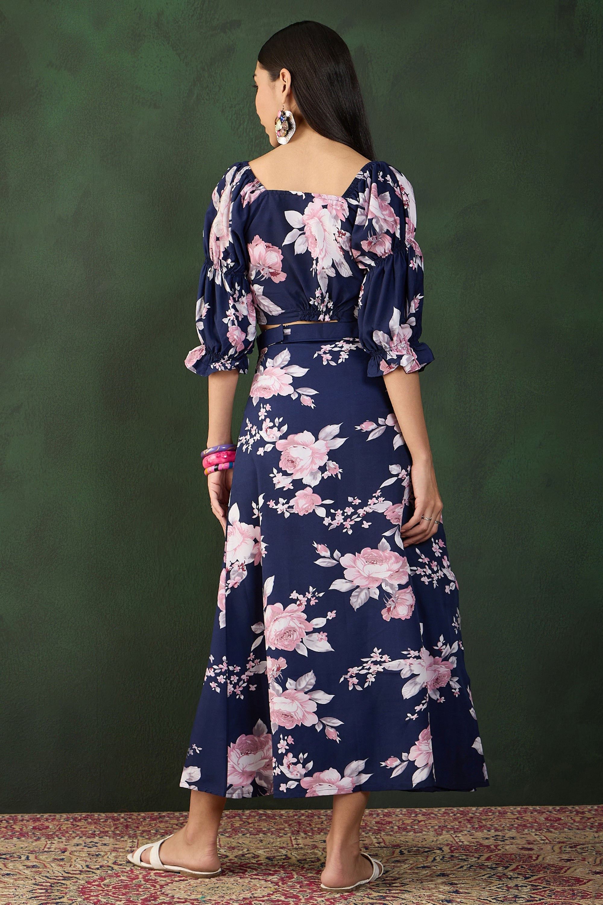 Exclusive Blue Crepe Floral Printed Top With Matching Skirt