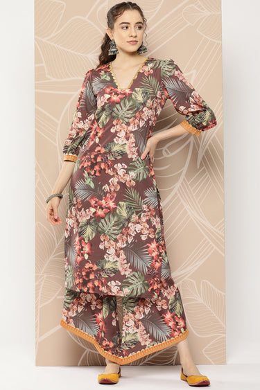 Exclusive Brown Crepe Fabric Casual Wear Floral Printed Readymade Top With Bottom Set