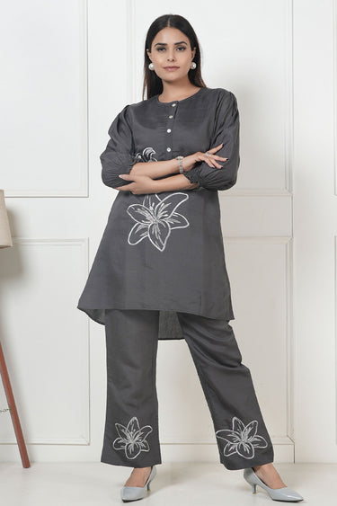 Exclusive Dark Grey Embroidered Viscose Tunic With Pant