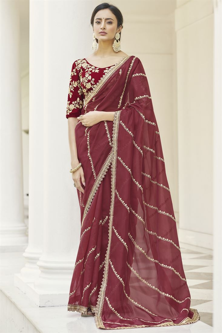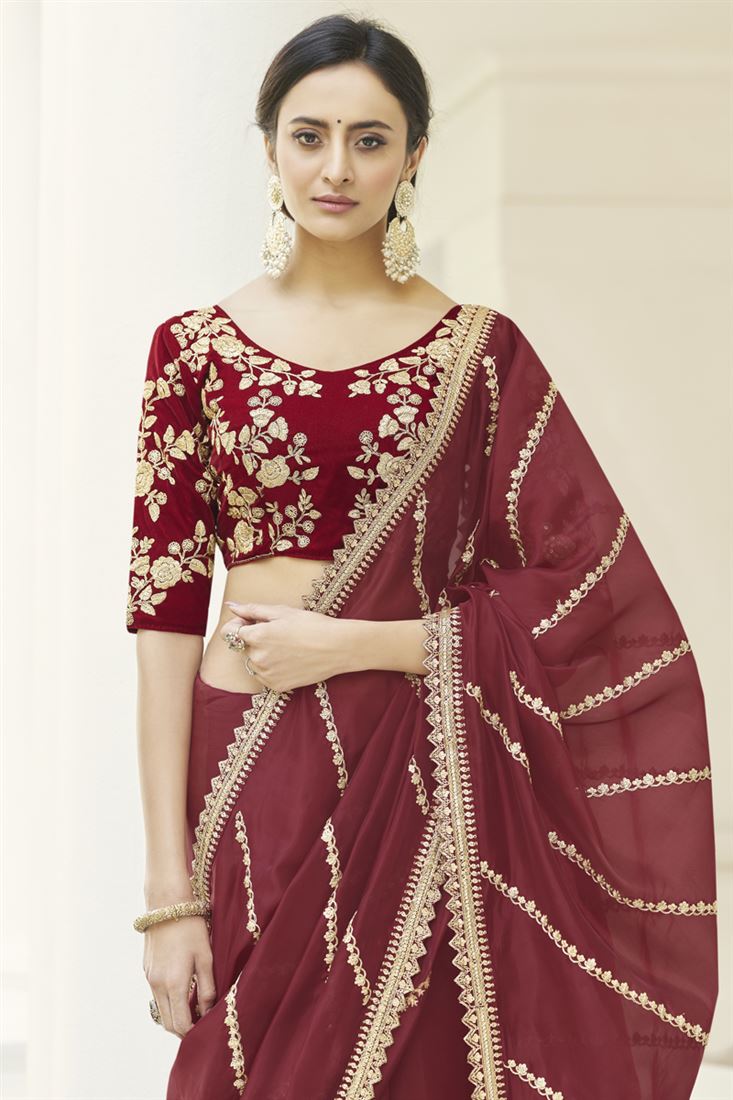 Exclusive Embroidered Work Incredible Organza Fabric Maroon Color Party Wear Saree