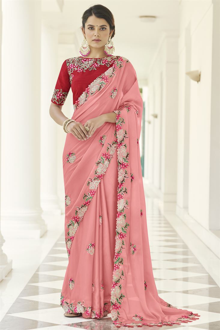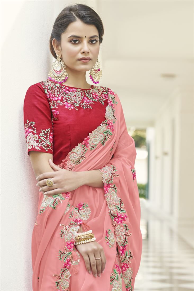Exclusive Excellent Georgette Fabric Peach Color Beautiful Embroidered Work Saree