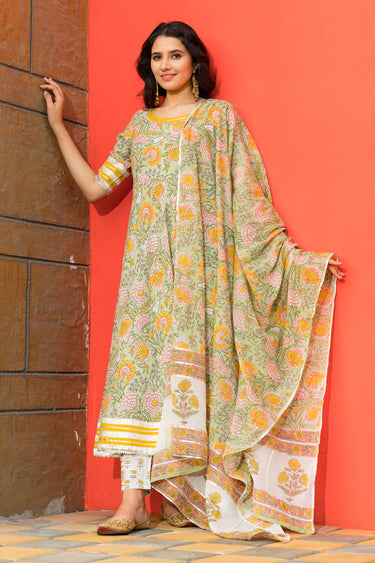 Exclusive Green Color Cotton Fabric Hand Block Gota Pati Work Readymade Top With Bottom Dupatta Set
