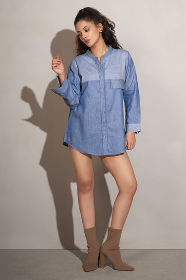 Exclusive Kameez Blue Cotton Doby Print Shirt With Rhinestone