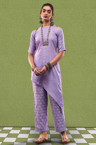 Make a statement in our Exclusive Lavender Color Cotton Jacquard Fabric Party Wear Designer Readymade Fusion Kurta Set. The lilac paneled kurta features an asymmetrical hemline that adds modern flair, while the cut-out detail on the shoulder creates an alluring look. Made with premium quality cotton jacquard fabric, this fusion kurta set is comfortable and breathable for those special occasions. The straight fit tonal trousers add a sophisticated touch to complete your fashionable ensemble. Perfect for formal events or cultural celebrations, this designer fusion kurta set is sure to turn heads and make you feel confident in your unique style. Order now to elevate your wardrobe!