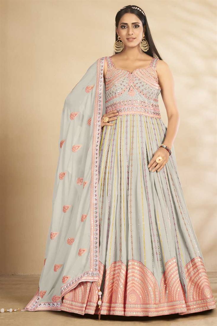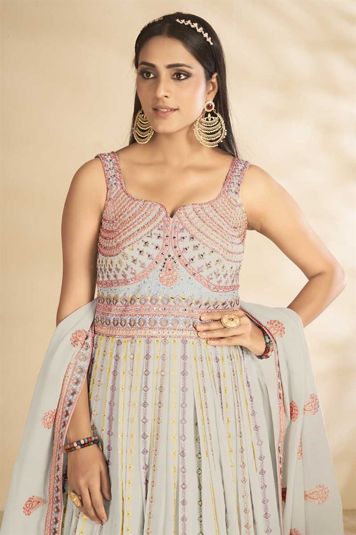 Exclusive Light Cyan Color Function Wear Embroidered Work Luminous Long Gown With Dupatta In Georgette Fabric