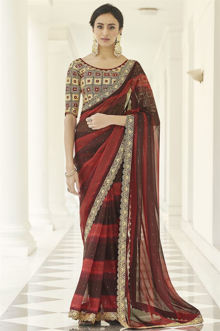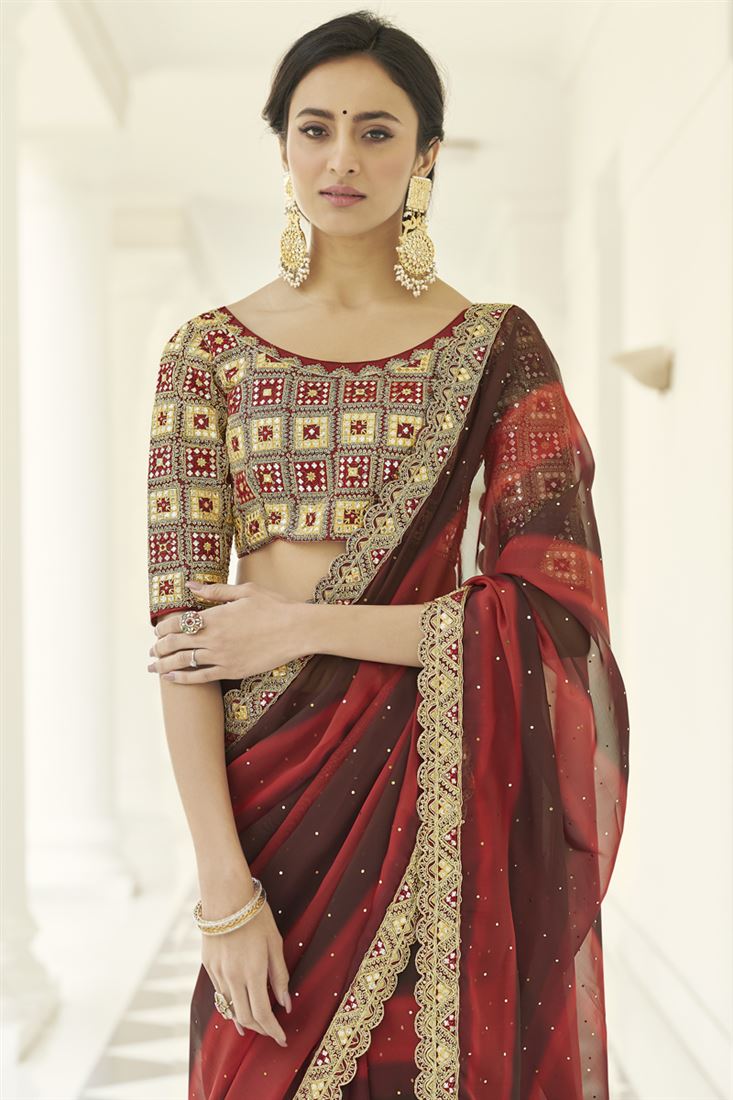 Exclusive Maroon Color Embroidered Work On Organza Fabric Party Wear Stunning Saree