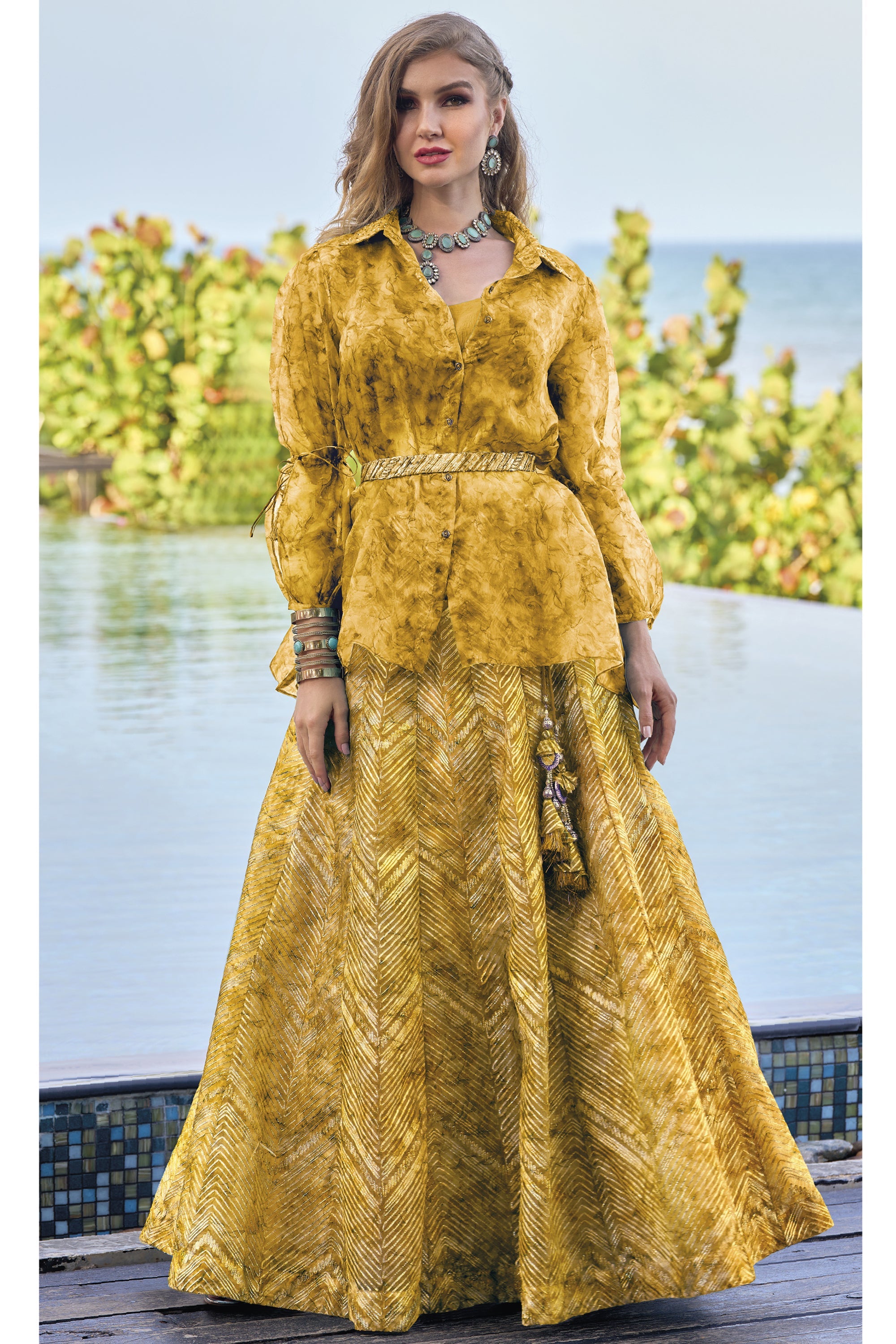Exclusive Mustard Color Festive Wear Printed Top With Skirt In Art Silk Fabric