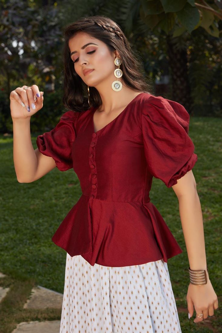 Exclusive Off White Color Fancy Fabric Party Wear Indo Western Top And Printed Skirt