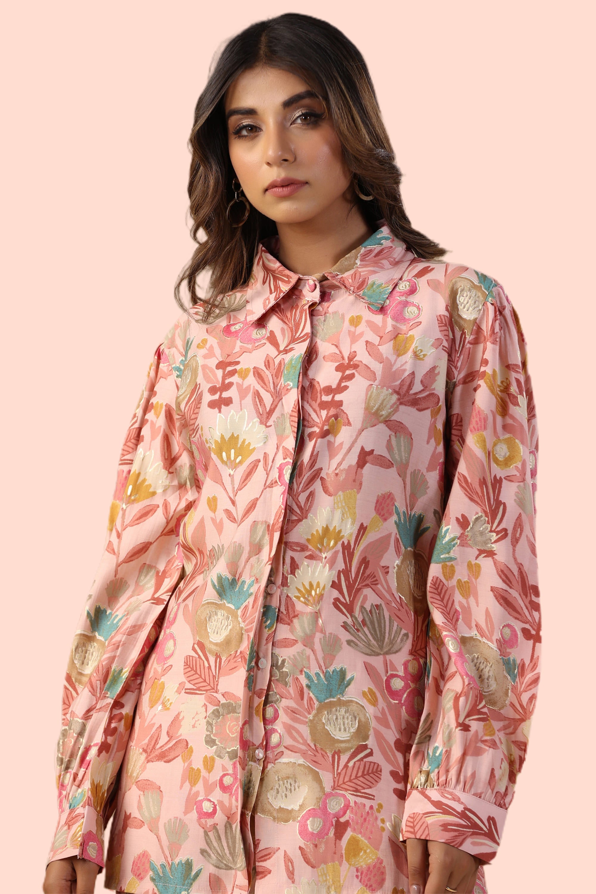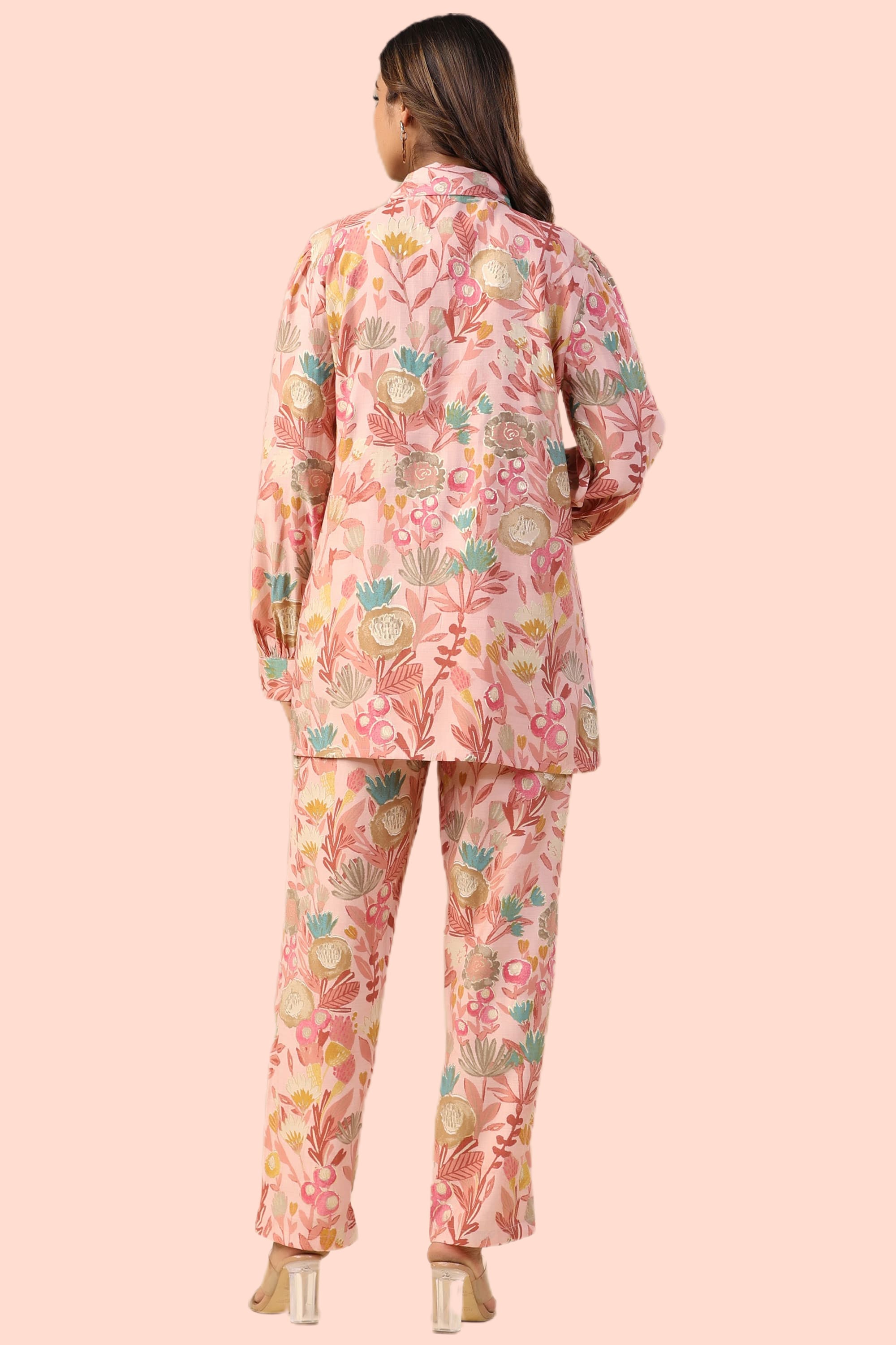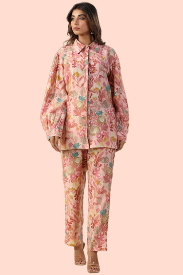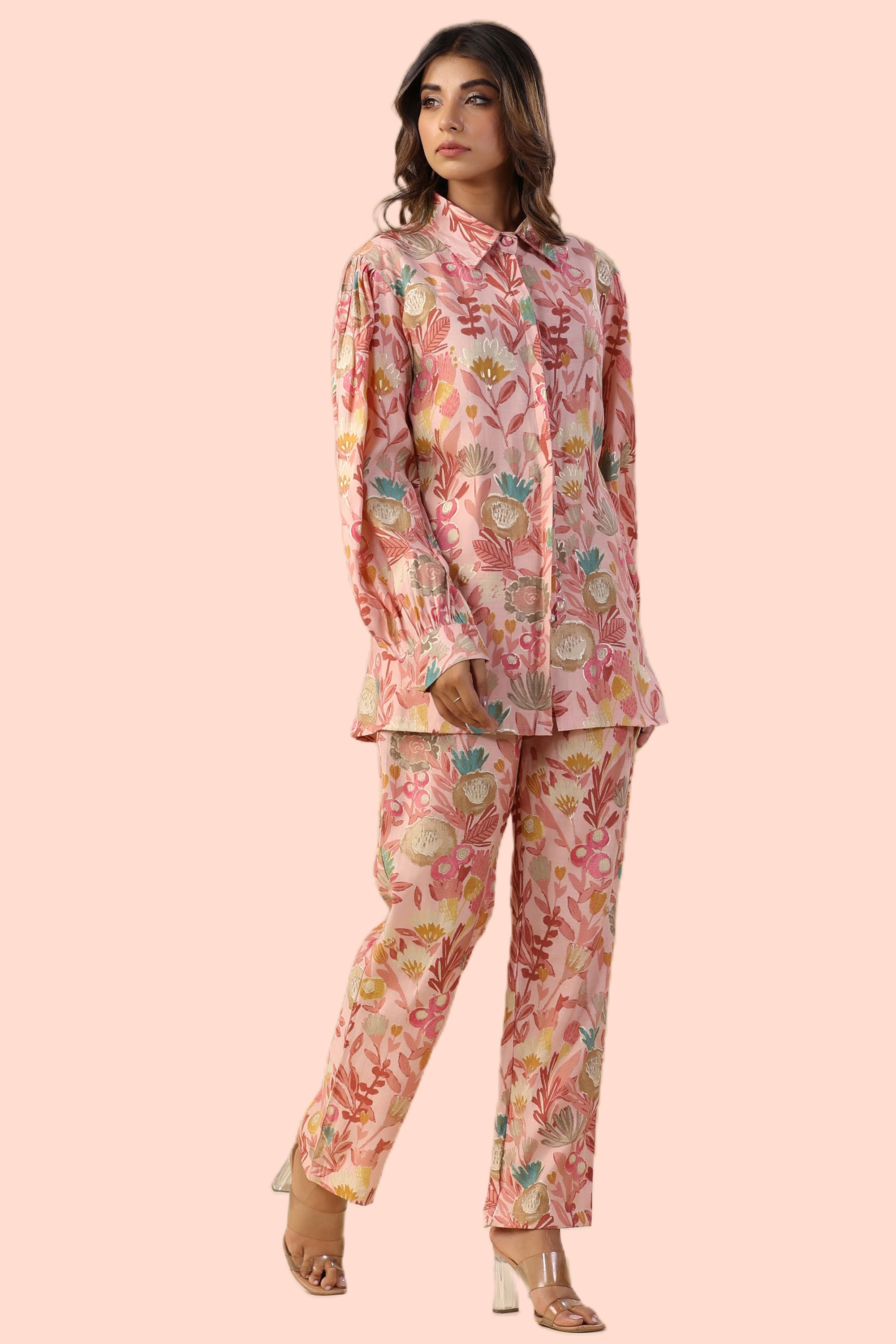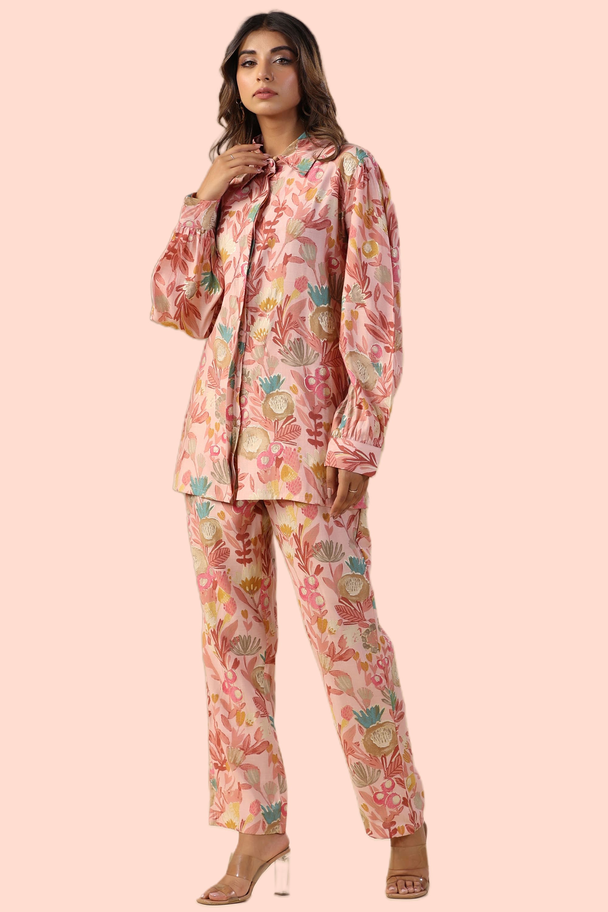 Exclusive Pink Color Two Piece Floral Print Shirt And Pant Readymade Co Ord Set