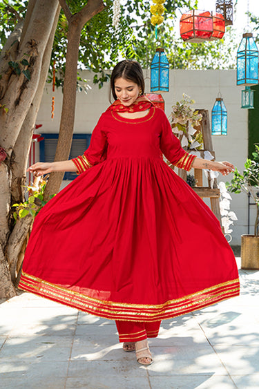 Exclusive Red Color Cotton Fabric Gota Pati Work Readymade Top With Bottom Dupatta Set