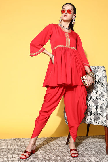 Exclusive Red Color Crepe Fabric Daily Wear Fancy Readymade Top With Bottom Set