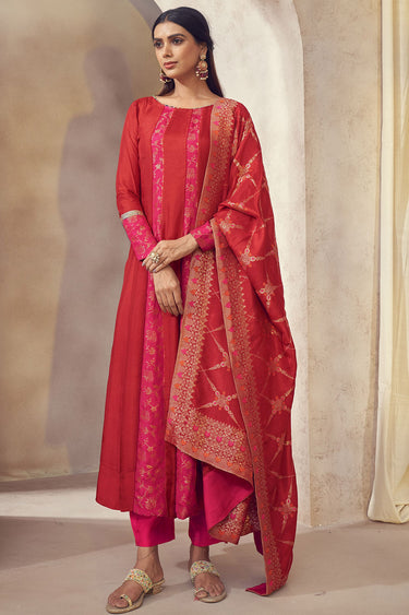 Exclusive Red Color Dola Silk Jacquard Fabric Weaving Jacquard Readymade Anarkali Kurta Set
