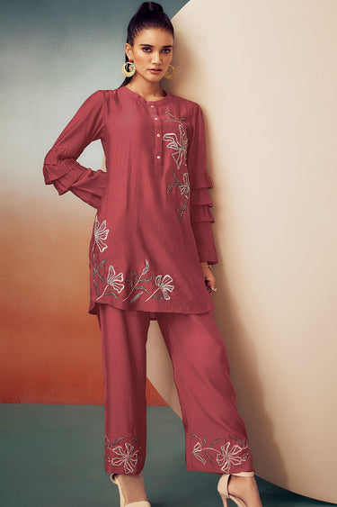 Exclusive Rusty Red Embroidered Tunic With Trouser Set