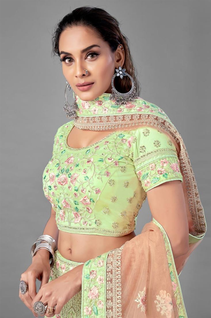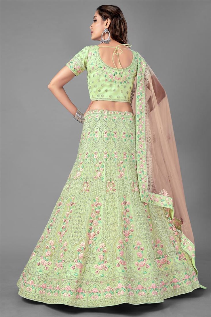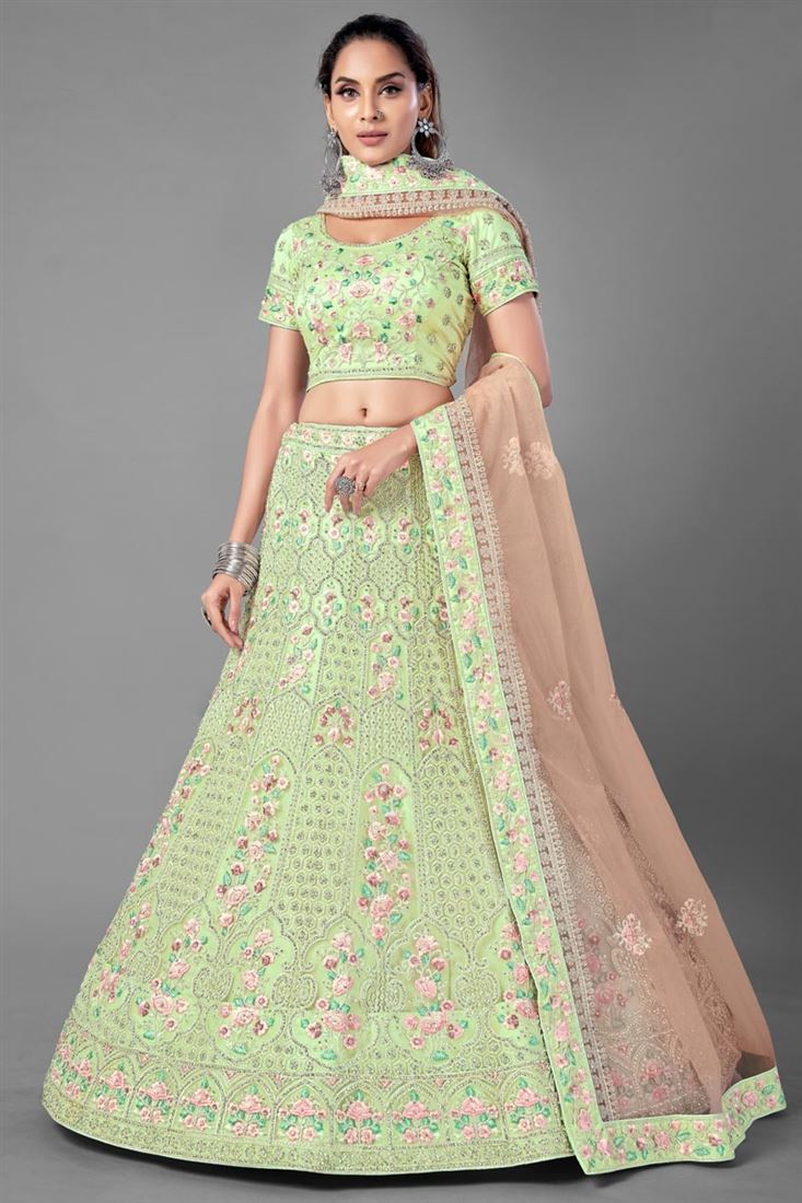 Exclusive Thread Embroidered Sea Green Color Net Fabric Sangeet Wear Lehenga Choli