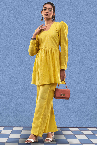 Exclusive Yellow Color Cotton Jacquard Fabric Party Wear Designer Readymade Fusion Kurta Set