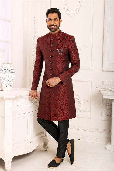 Extravagant Maroon Color Brocade Fabric Indo Western For Men