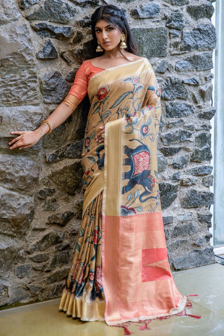 Fancy Fabric Embellished Printed Beige Color Casual Look Saree