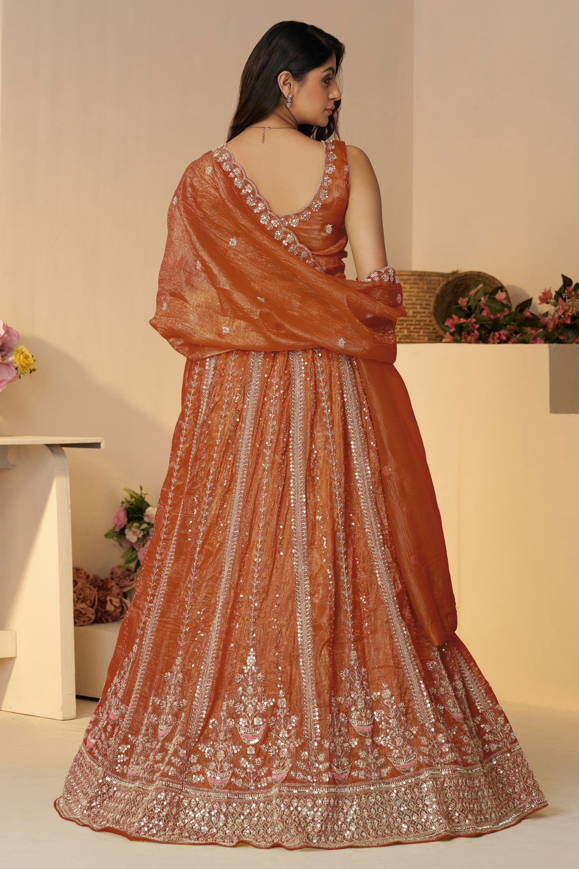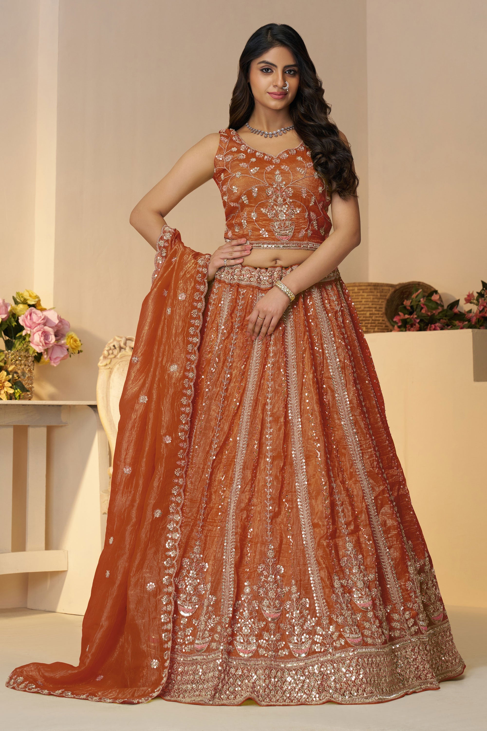 Fancy Fabric Function Wear Sequins Work Lehenga Choli In Rust Color