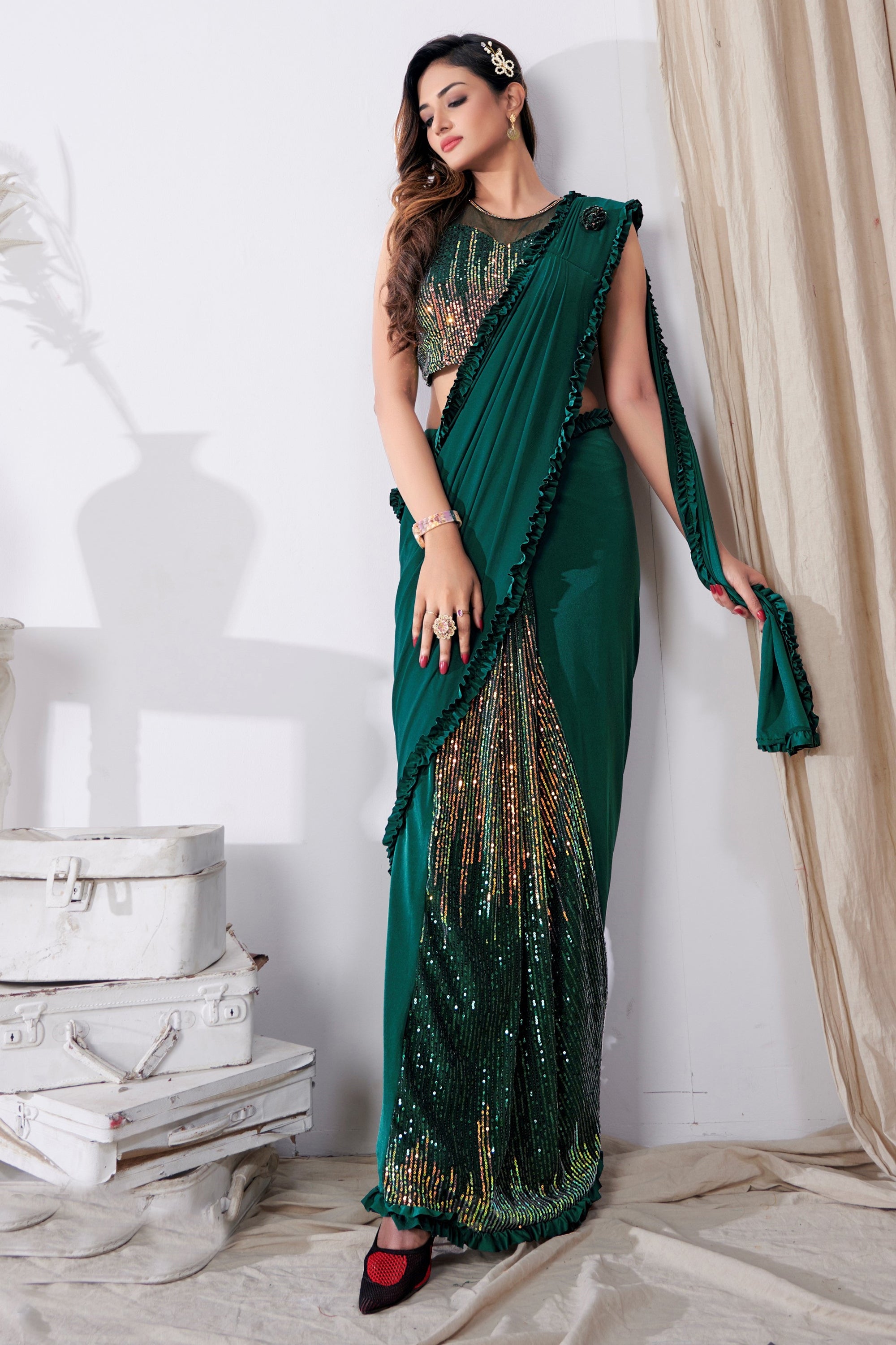 Fancy Fabric Party Style Luxurious Sequins Work Designer One Minute Saree In Green Color