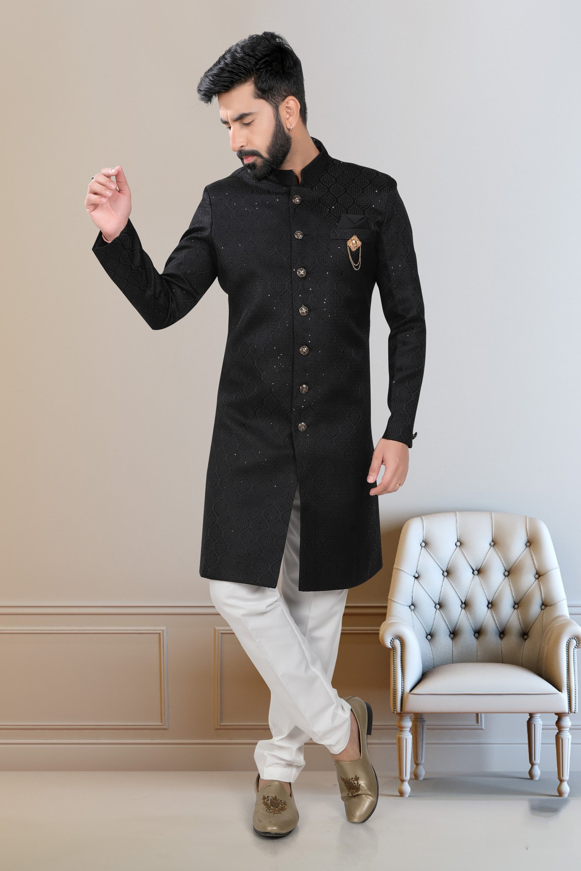 Fancy Fabric Stunning Black Wedding Wear Readymade Men Indo Western