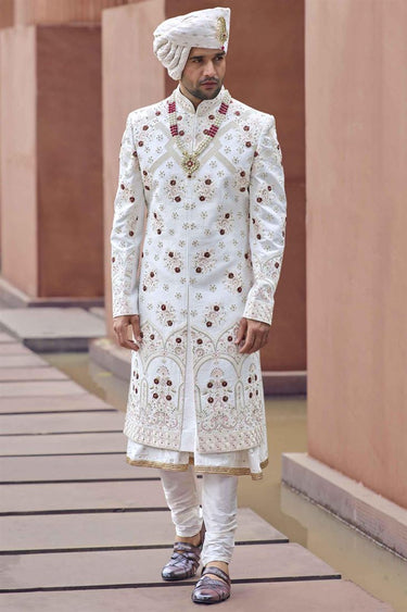 Fascinate White Color Fancy Fabric Heavy Embroidered Designer Indowestern Groom Sherwani