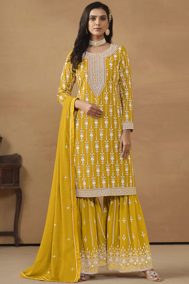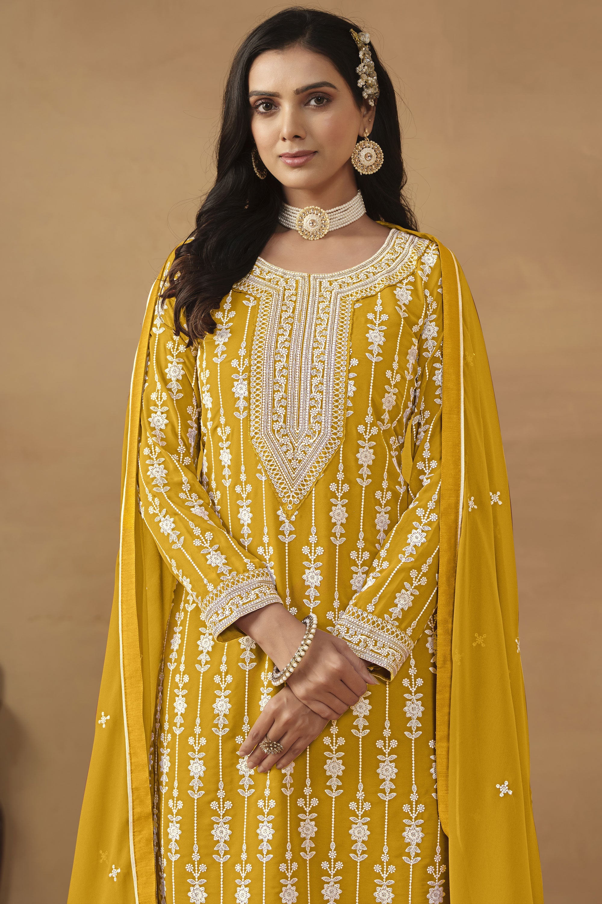 Fascinating Sangeet Wear Yellow Color Georgette Embroidered Palazzo Suit