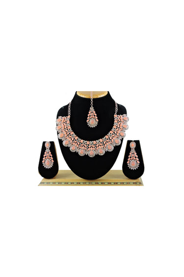 Fashionable Peach Color Alloy Material Necklace with Earrings and Mang Tikka
