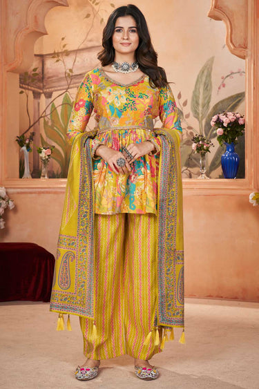 Fashionable Yellow Color Readymade Art Silk Palazzo Suit