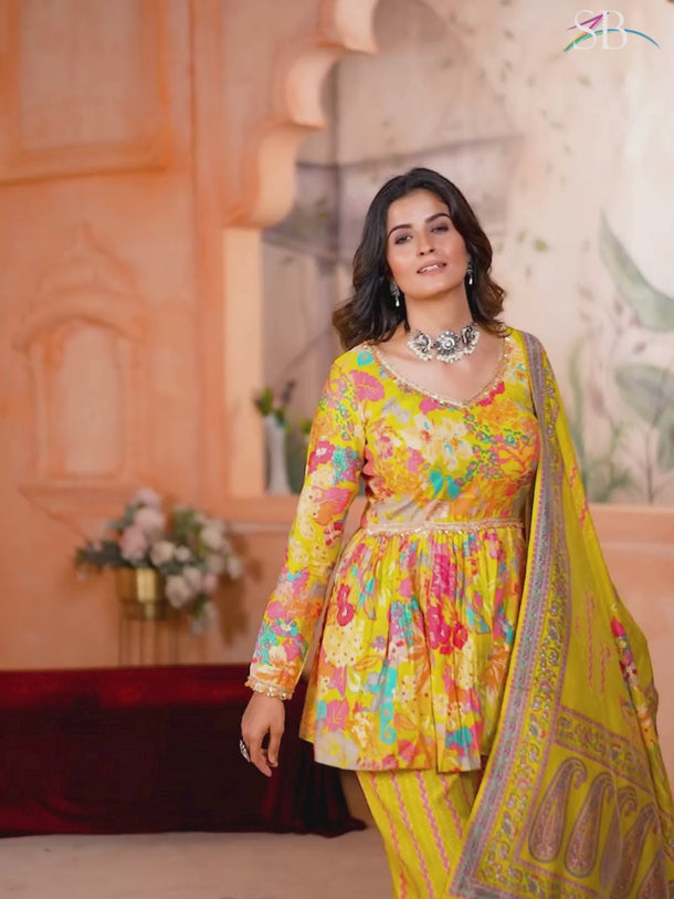 Step into elegance with our Palazzo Suit crafted from luxurious Silk. Designed for those special occasions, this readymade outfit features a stunning digital foil-printed design that adds a touch of sparkle to your style. With a flowing palazzo bottom, a perfectly matched top, and a graceful dupatta, all made from premium silk, this ensemble is perfect for making a statement at any function. Available in sizes 38, 40, and 42, it promises a flattering fit. Slight color variations may occur due to different lighting conditions