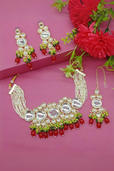 Febulous Alloy Material Red Color Necklace Set Earrings And Mang Tikka For Women