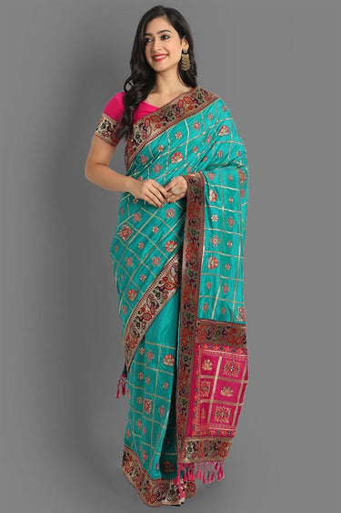 Festival Wear Art Silk Fabric Cyan Color Embroidered Work Sensational Patola Saree