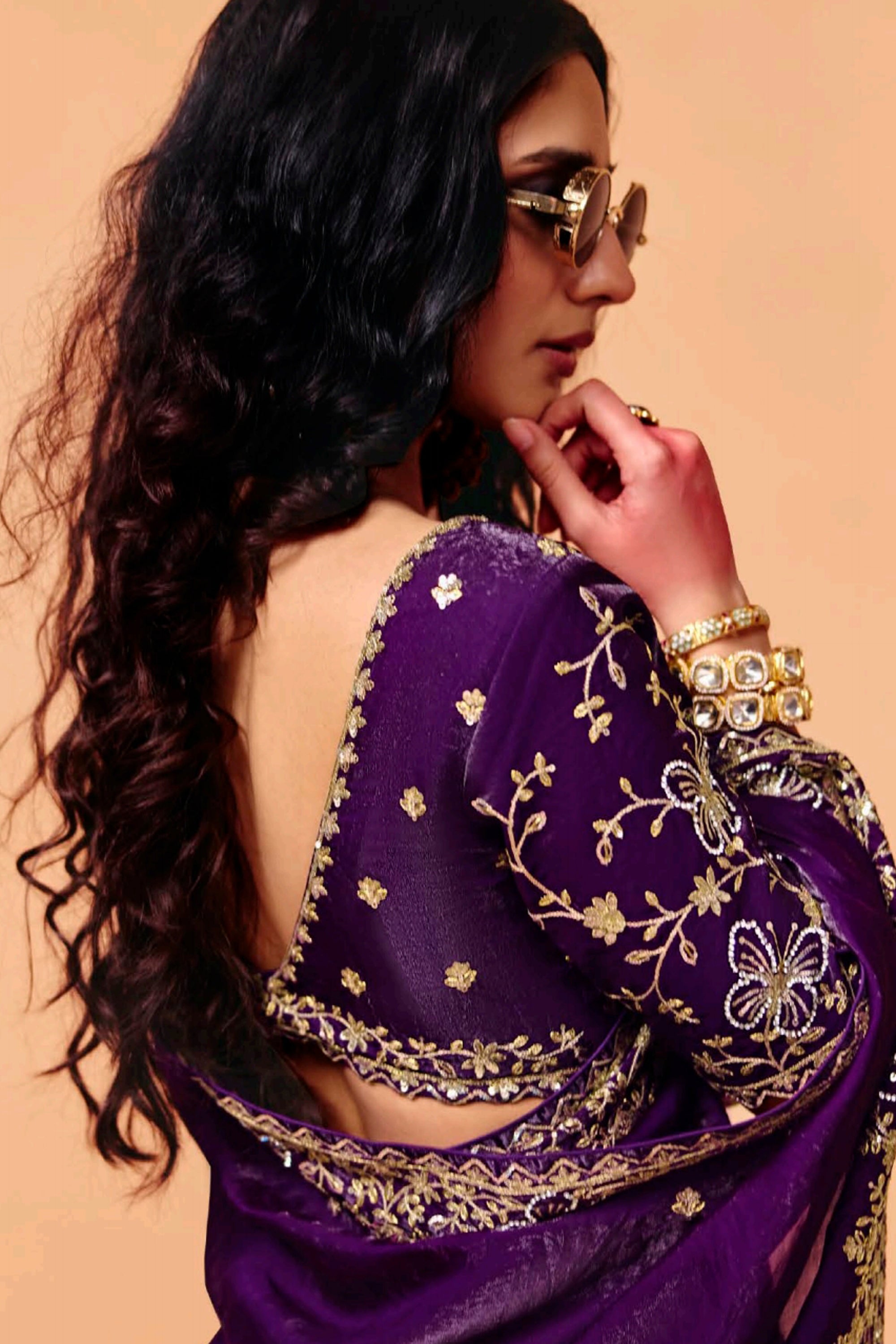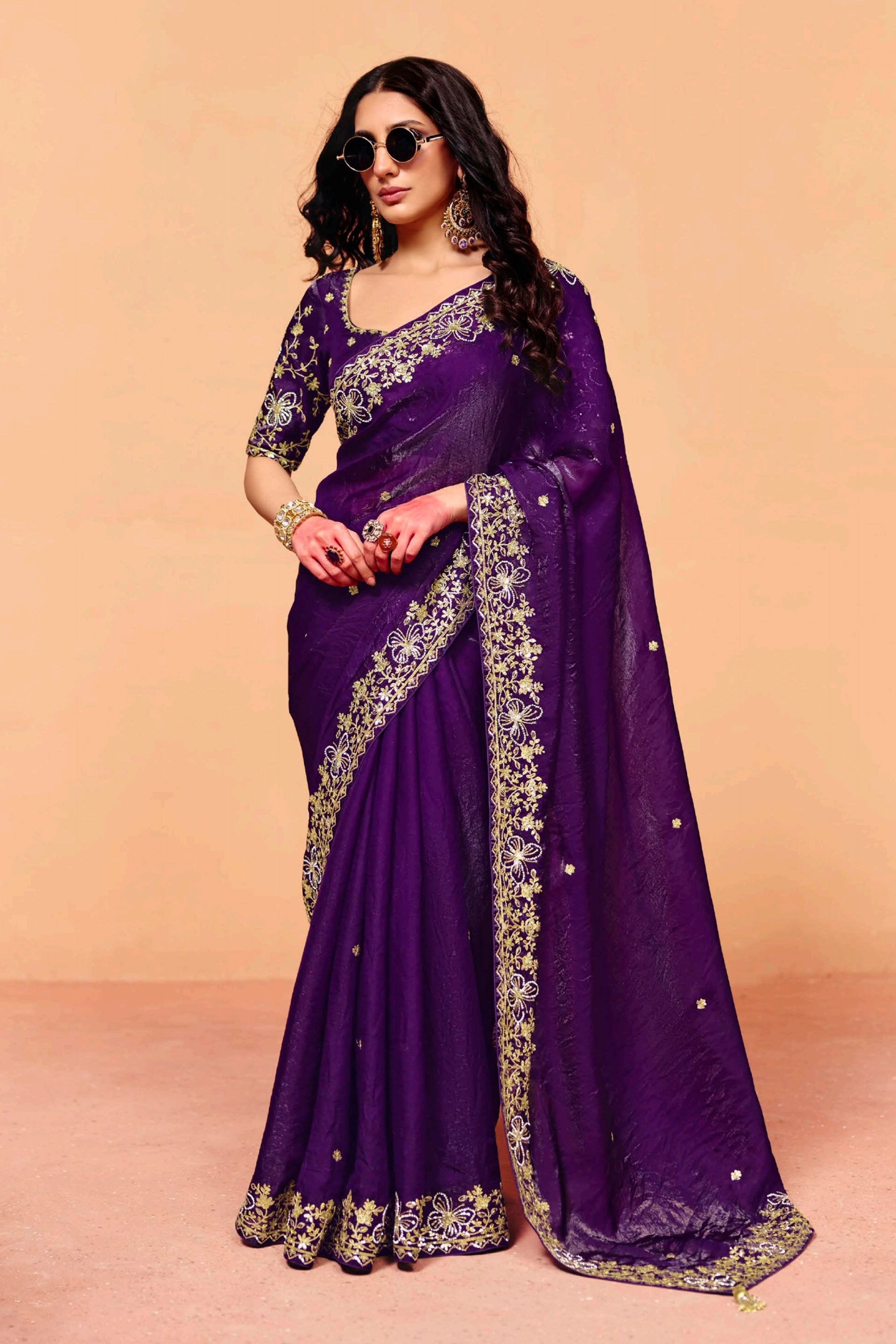 Step into any festive event with grace wearing this exquisite Tissue Silk Embroidered Saree. This traditional piece features a finely detailed border that highlights its delicate artistry and refined appeal. Lightweight and easy to drape, the luxurious fabric is ideal for long hours of celebration, ensuring style and comfort. The included unstitched blouse gives you the freedom to personalize the look to your unique taste. Whether its a Sangeet, wedding, or other grand occasion, this saree is sure to draw compliments and make you stand out effortlessly. An elegant choice for lovers of fine ethnic wear.