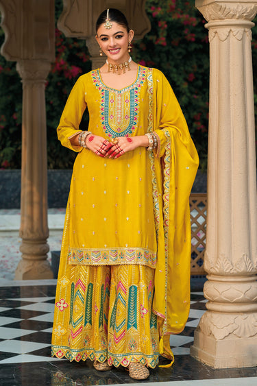 Festive Wear Chinon Yellow Designer Readymade Palazzo Dress