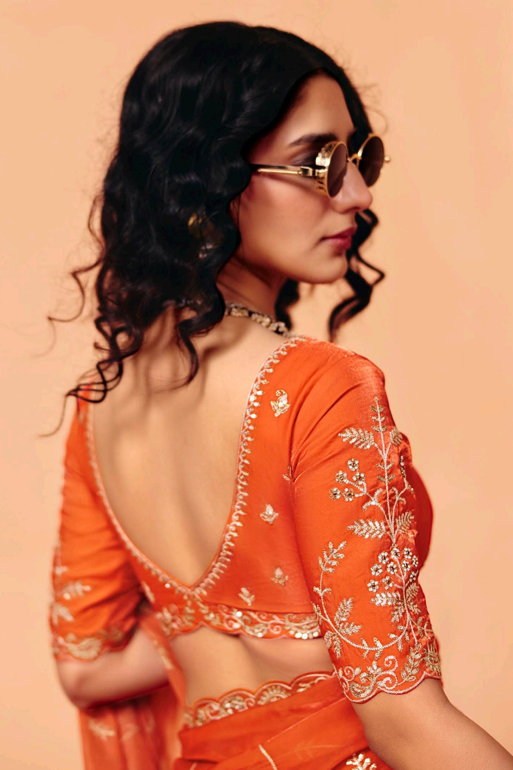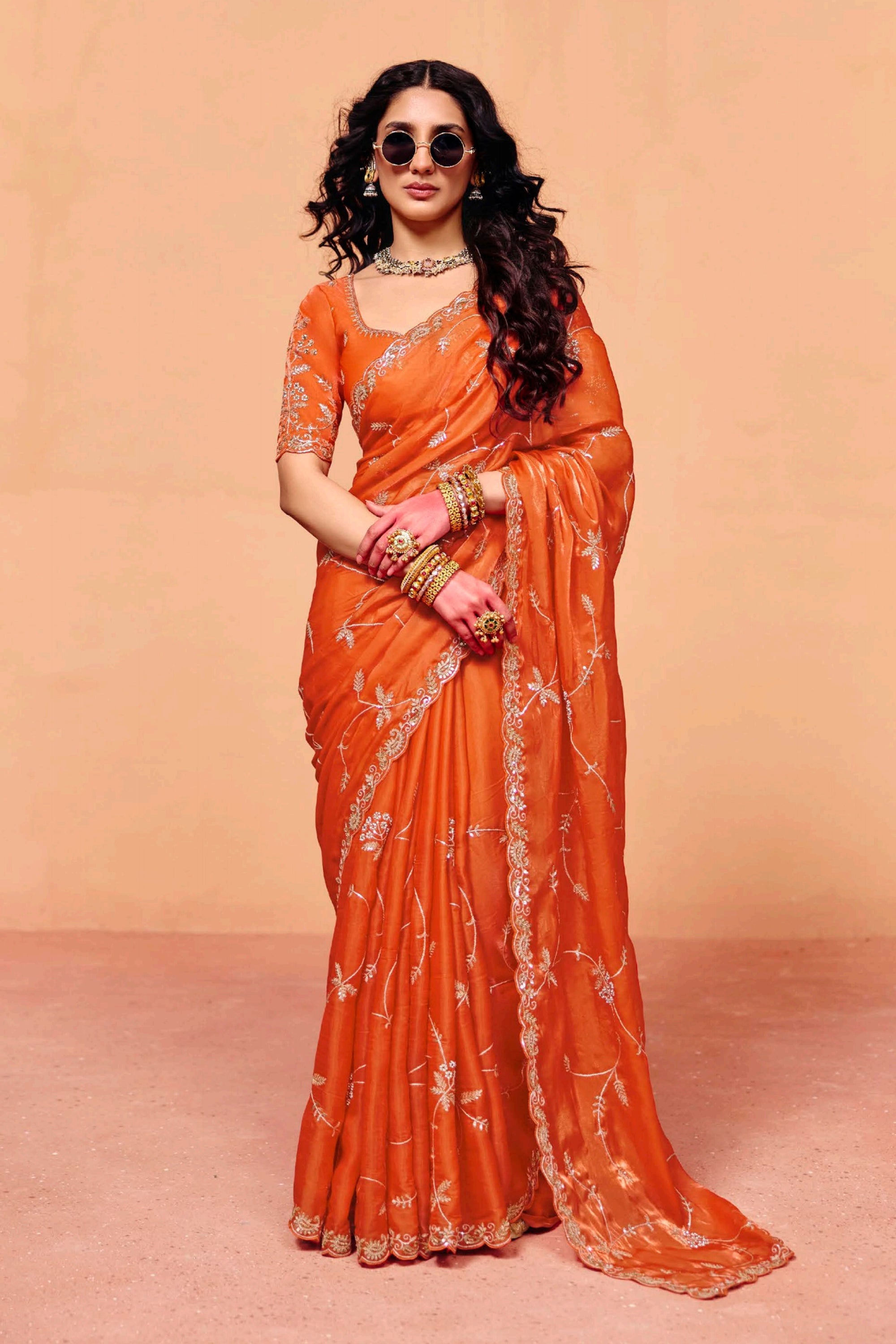 Make a lasting impression at your next celebration with this stunning Tissue Silk Traditional Saree. Designed for Sangeet and other special events, it showcases a detailed embroidered border that adds timeless sophistication to your look. The high-quality tissue silk fabric offers a perfect balance of comfort and elegance, making it suitable for day-to-night festivities. The unstitched blouse gives you the opportunity to create a customized fit that matches your individual style. Perfect for weddings and festivals, this saree captures the beauty of heritage fashion with a touch of contemporary finesse. Add this statement piece to your wardrobe today.