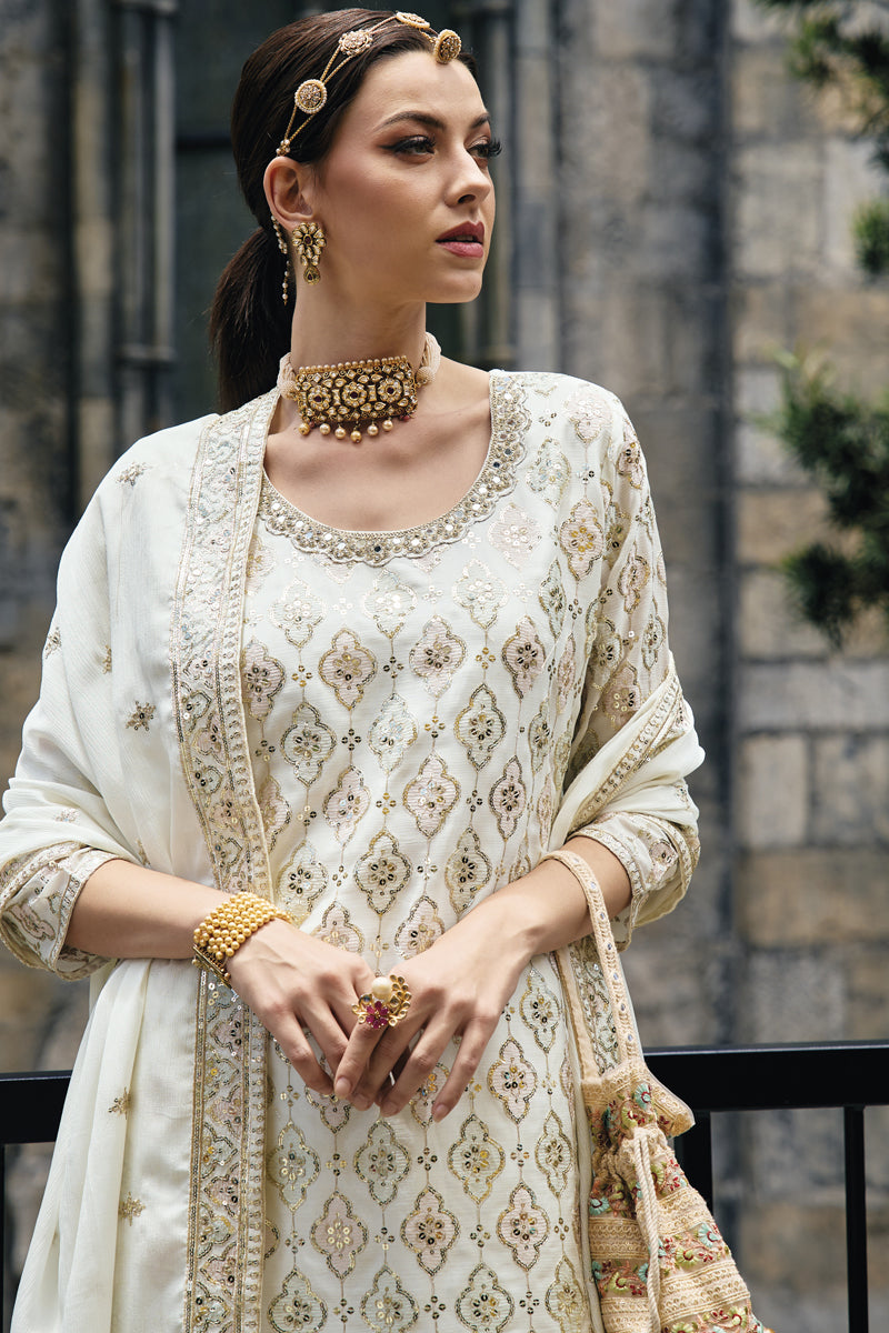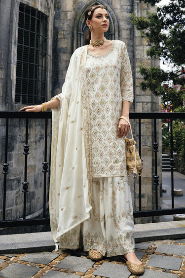 Festive Wear Embroidered Readymade Palazzo Salwar Kameez In Chinon Fabric Beige Color
