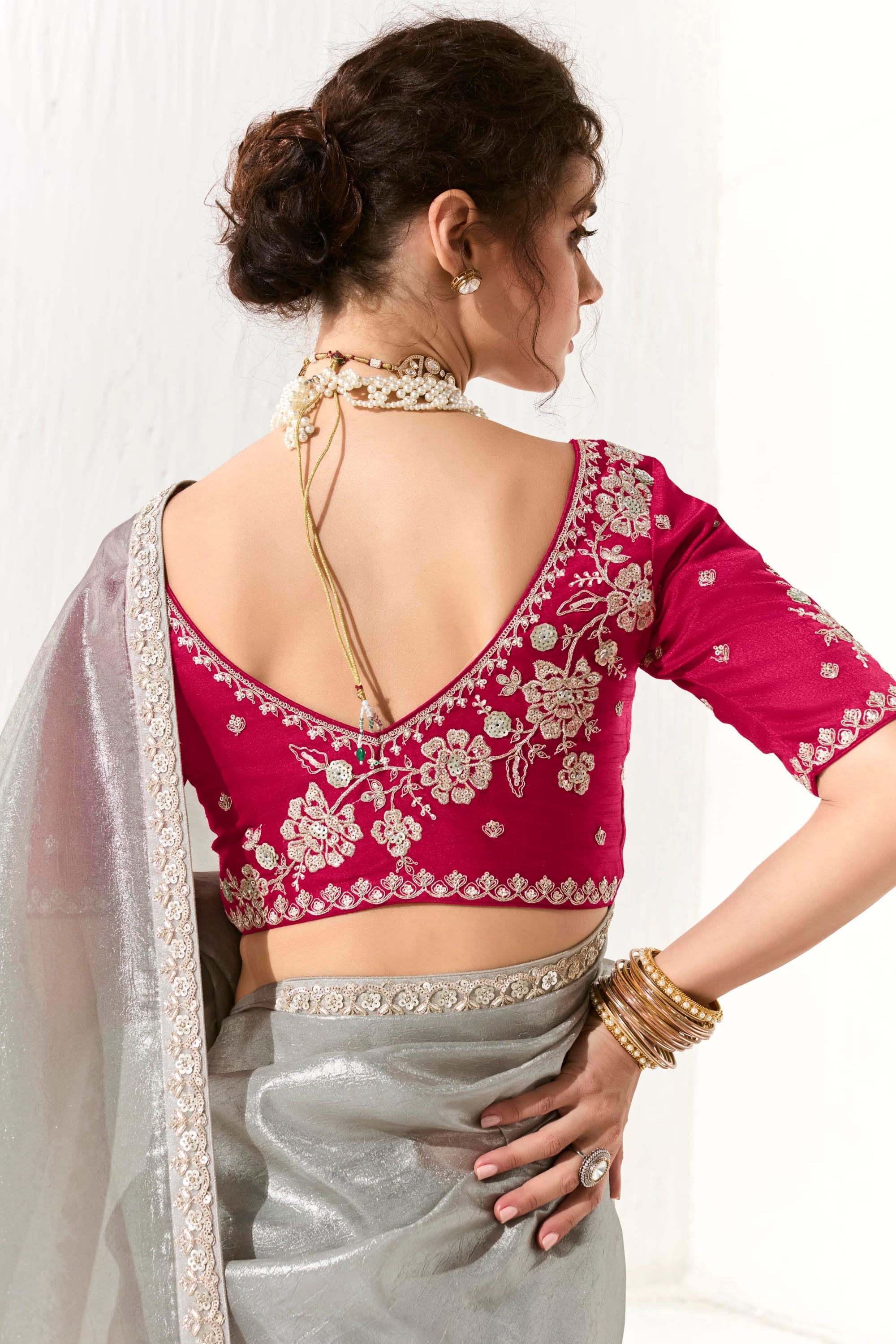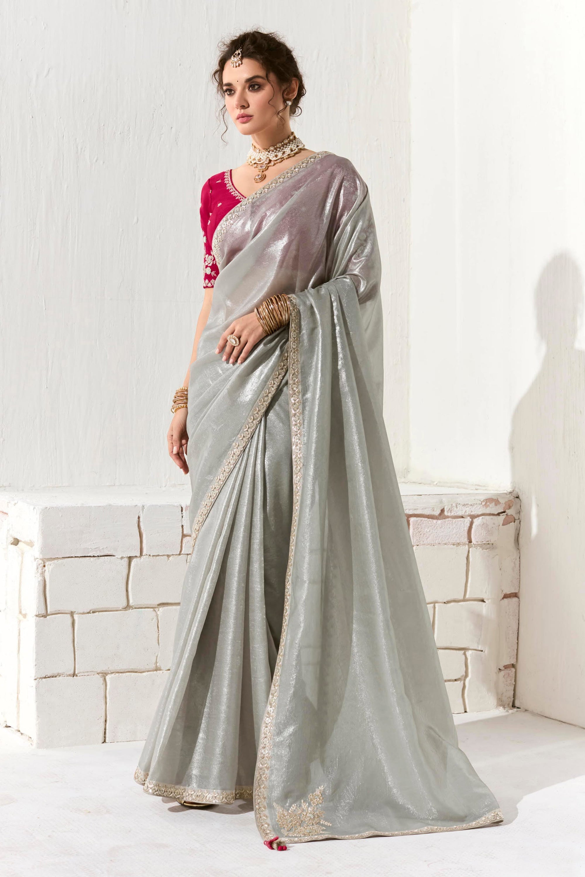 Festive Wear Organza Lace Border Work Saree In Grey Color