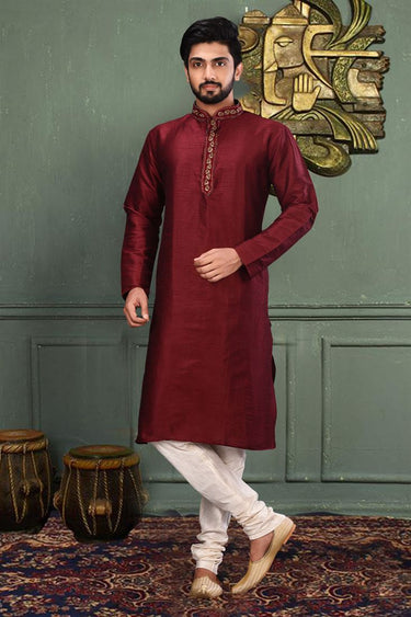 Festive Wear Readymade Kurta Pyjama For Men In Wine Art Silk Fabric