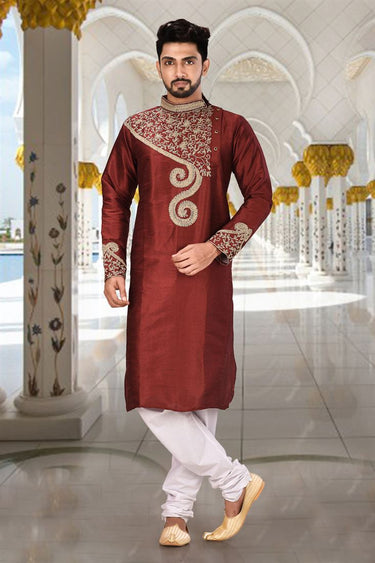 Festive Wear Readymade Lovely Kurta Pyjama For Men In Maroon Color