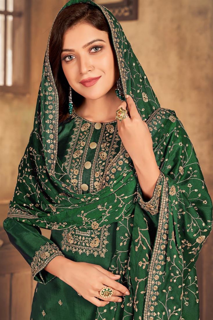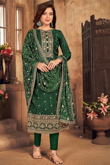 Festive Wear Viscose Fabric Dark Green Embroidered Straight Cut Suit